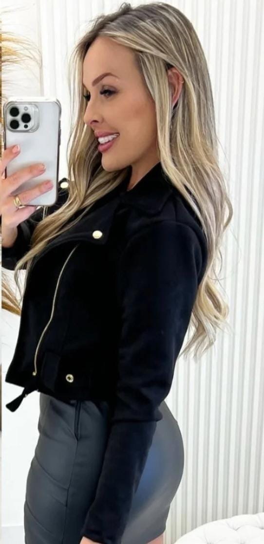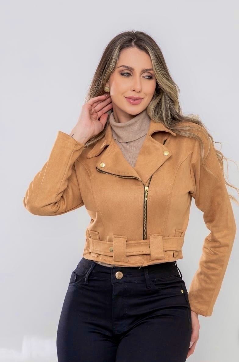 Jaqueta de suede importado, com fechamento frontal em zíper, cintura ajustada com cinto removível, botões e zíper dourados